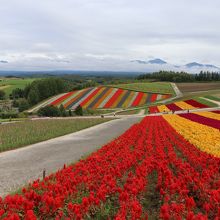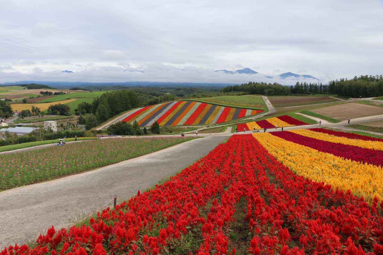 美瑛の丘陵地帯に広大な花畑が広がっていて、9月の訪問時には色とりどりの花がきれいに咲いていました。かなり広いので端から端まで歩くと30分以上かかると思います。しかも丘なのでアップダウンも結構激しいです。このため、園内には有料のカートが借りられるようになっていて、多くの人が利用していました。