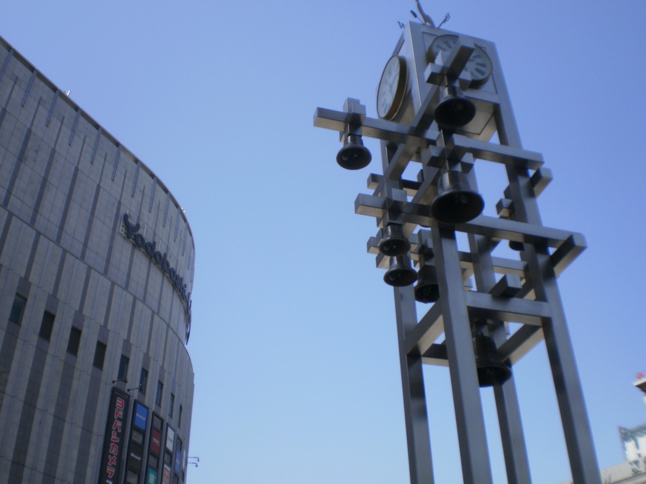 JR大阪駅の北口と阪急うめだ駅を結ぶところにカリヨン広場があります。背の高い時計塔にの上にたくさん鐘がぶらさがっています。大阪駅には風の広場やアトリウム広場などがあり、これがここの目印ですね。 屋根がないところだし、人通りが多いです。周囲にはヨドバシカメラの大きな建物などがあります。