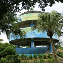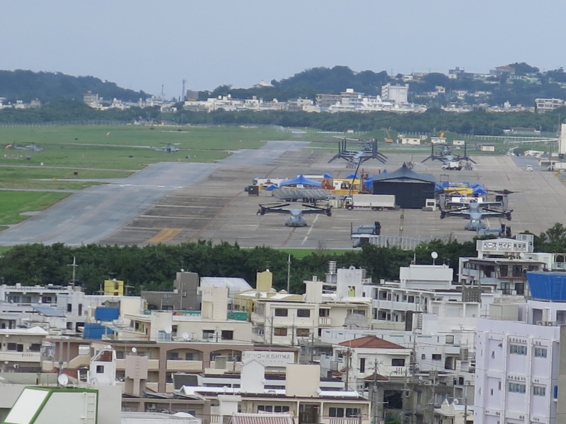 地球儀の形をした展望台からは、基地を一望。オスプレイも実際に見ることができます。