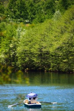 あかんだな駐車場にクルマを置いて、上高地のシャトルバスに乗り換え。駐車場に入ろうとしたら目の前をバスが…行っちゃった。待合所の建物で30分待機して、いよいよ念願の上高地へ。終点まで行かず、手前の大正池で下車。ここから遊歩道を河童橋まで歩こうって算段です。雲一つない快晴。学生時代(30年以上前です)から憧れだったんだよなー、上高地!とまずは大きく深呼吸をひとつ。池のほとりへくだり降りると、正面に焼岳、足元にはエメラルド色した大正池。絶景絶景。まさに値千金で、きっと石川五右衛門は南禅寺には行っても上高地には来たことがなかったんだろう。池でボート遊びをしてる観光客がたくさんいて、待ちが出ているほどでした。