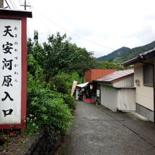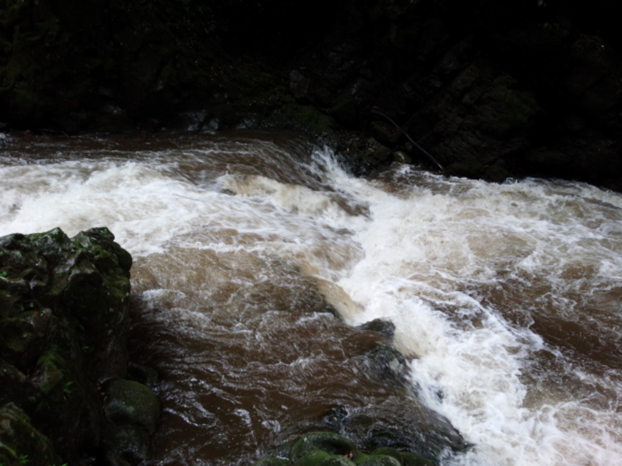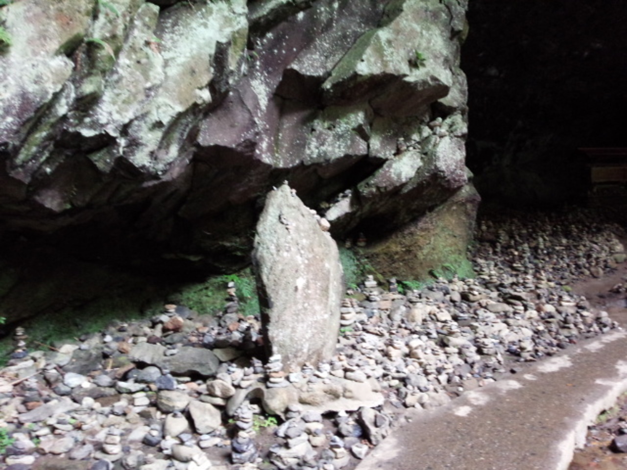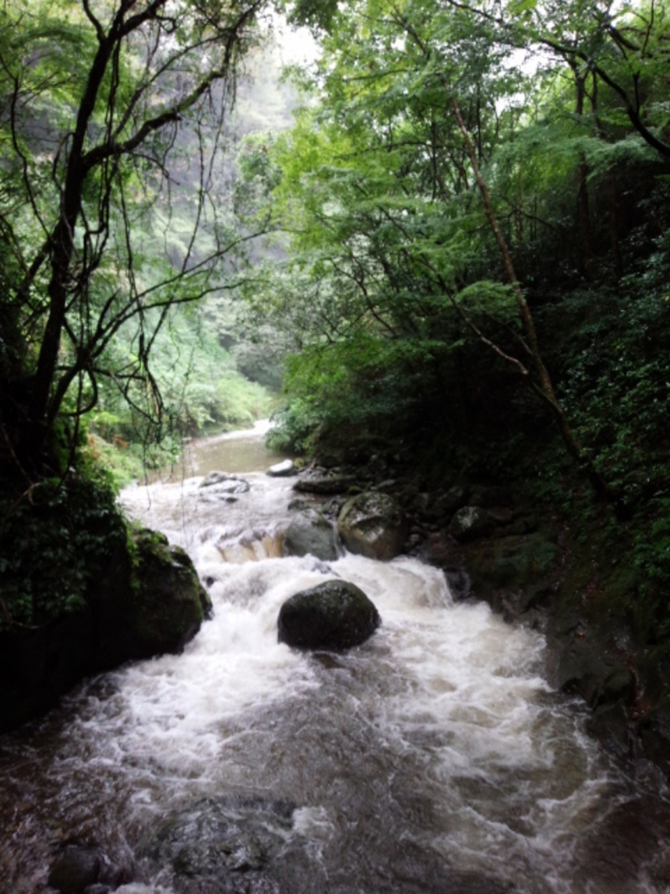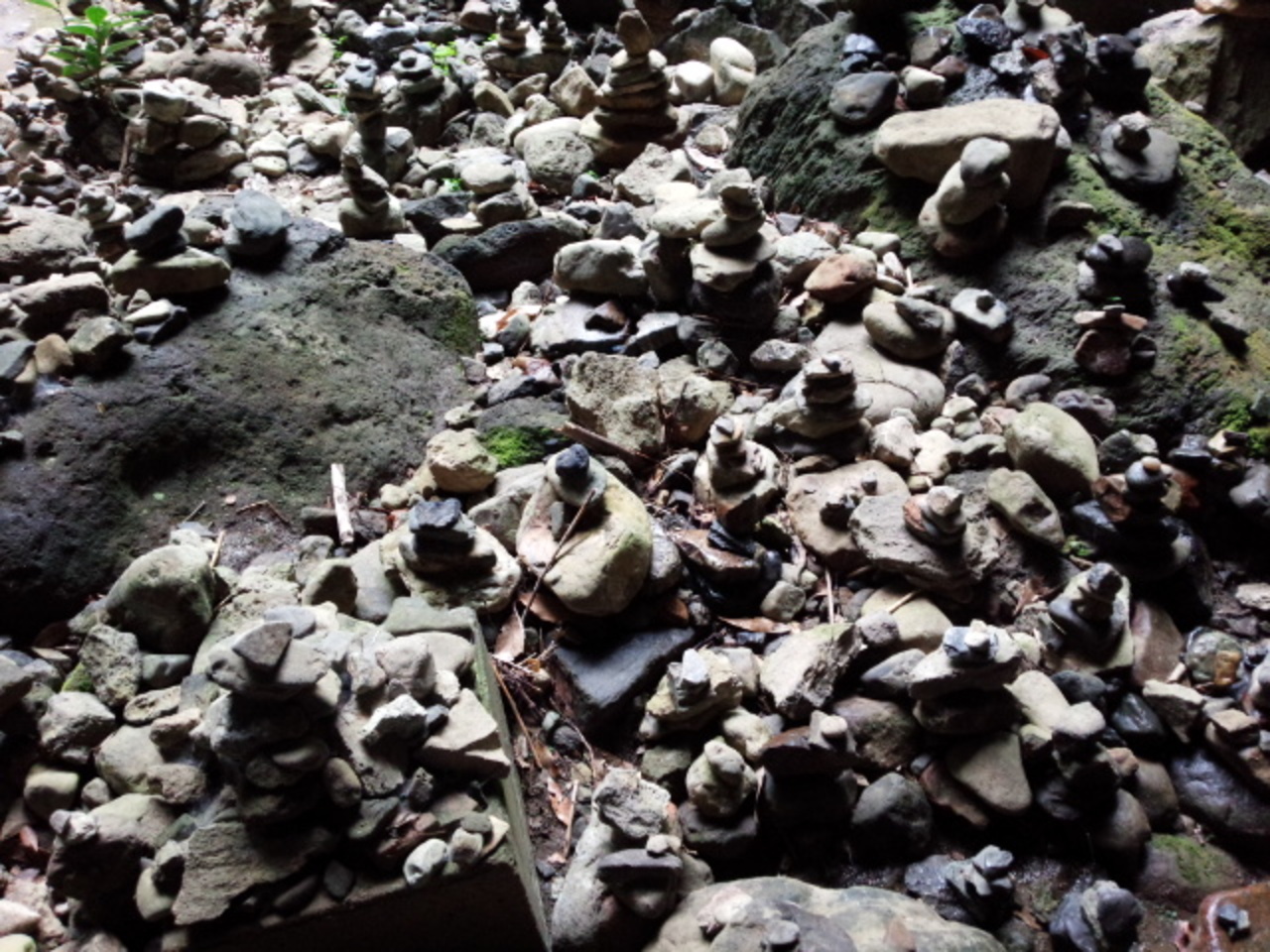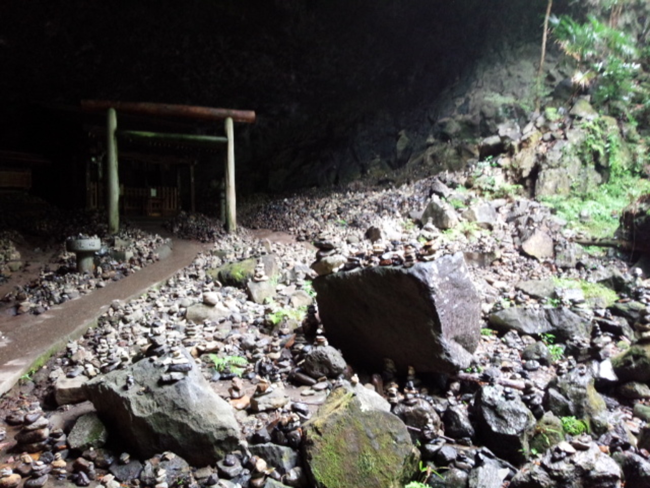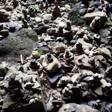 天岩戸神社から徒歩10分程で天安河原に行けます。この日は大雨で川が増水し、轟音の中歩いて行ったので少し怖かった! 細い小道の脇には急流が…… 八百万の神々が話し合いされたと言う河原に着くと、たくさんの石が積み上げられ、独特の雰囲気がありました。雨でなければ、ここは静寂に満ちたパワースポットなのだと思います。