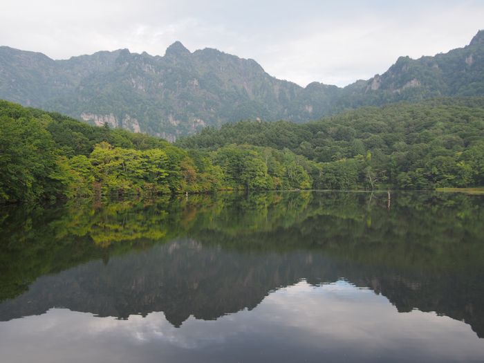 鏡のような水面に戸隠の山並みを美しく映し出すビューポイントです。