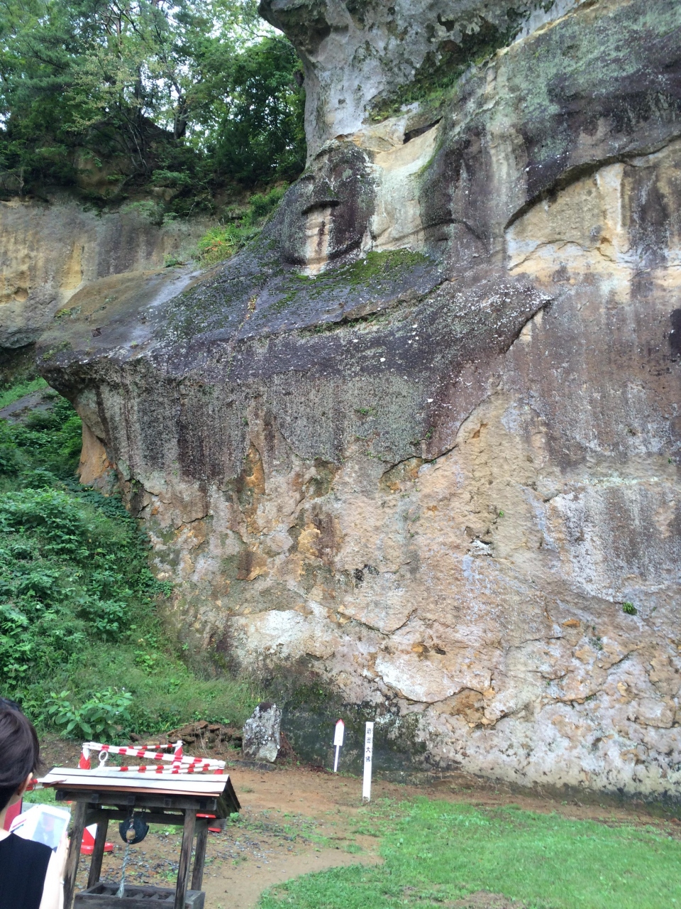 達谷窟の毘沙門堂の階段を下りると絶壁の岩がありますが、数十メートル歩いた大きな岩壁に大磨崖佛が刻まれています。しかし、良く目を凝らしてみないと解らない位磨滅が進んでいますので、立札の前の岩を見て大仏の顔らしきものを探して方が解りやすいと思います。これだけの大仏を絶壁とも呼べる岩に良く刻んだと思う位、他所では見れないと思います。