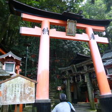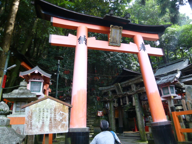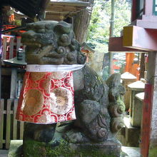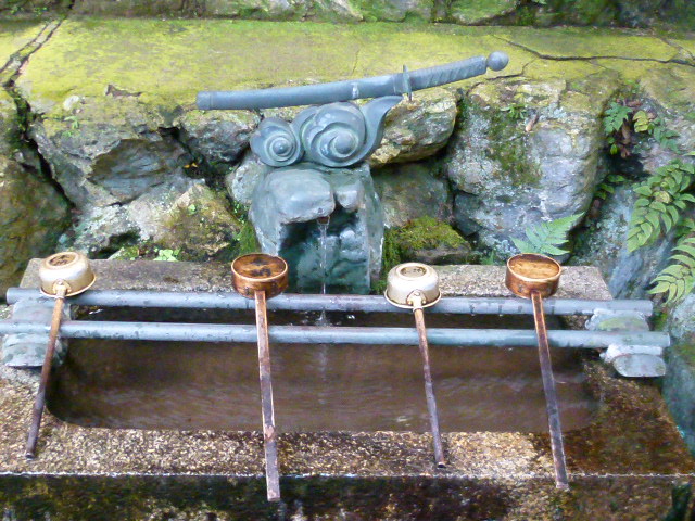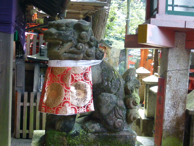 今日は京都・伏見稲荷大社に来ていますが、海外からの観光客に大人気とのこともあって賑わっています。稲荷山に登りました。途中四ツ辻からは右から回って頂上の「一ノ峯」に到達し、そしてここ「御劔社」に来ています。一ノ峯から千本鳥居はまだ続きますが下りの階段は膝にきますね。御劔社は古くからの神祭りの場所で、11月6日には火焚祭が執り行われます。また境内右には清らかな水の手水があり、境内に入ると前掛けをしたお洒落な獅子がお出迎えです。さぁーさらに下り、薬力社・眼力社へと行きましょう。