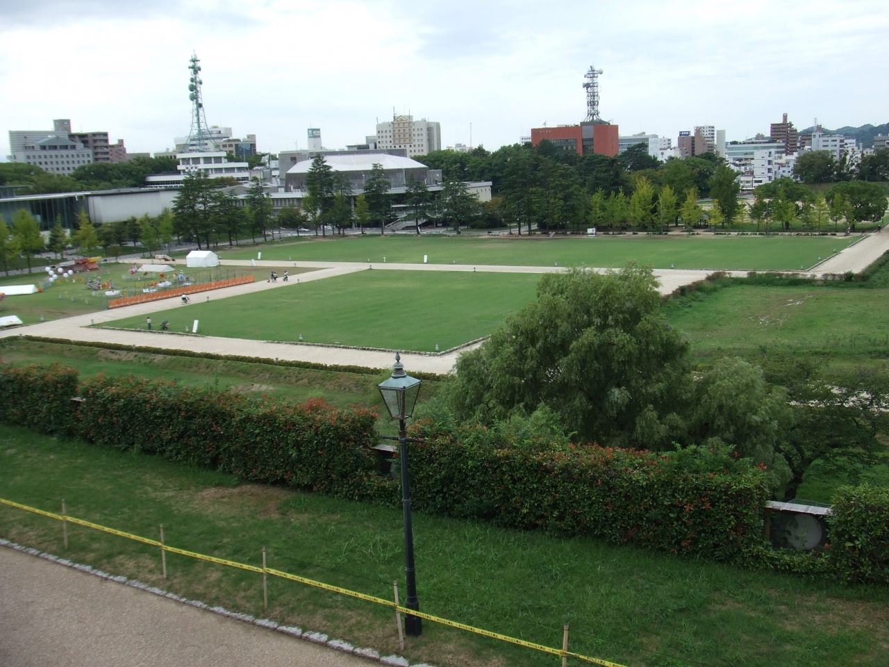 城山公園は、松山城の本丸、二之丸、三之丸(堀之内地区)を含めた全域を都市公園として開設したものだそうです。堀之内地区の大きな公園はイベントがよく行われるようで、私達が行った日も白いテントがはられてました。芝生がきれいな公園ですが、広すぎて横断するのもちょっとした時間がかかりそう。松山城の前にもちょっとした公園のようなスペースがあり、ふだんなら見晴らしが良さそうでしたが、雨だったのでお城に行く人以外の利用はありませんでした。