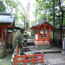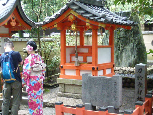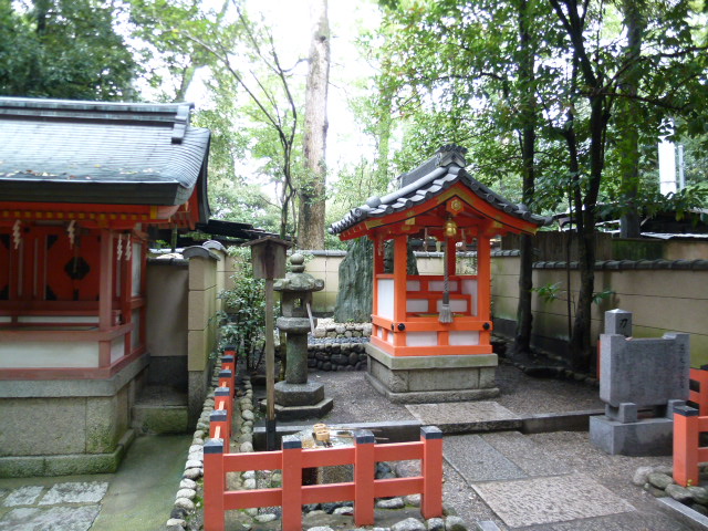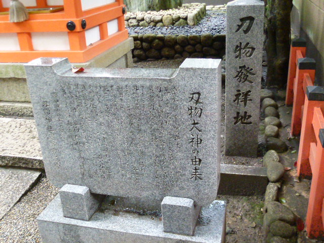 今日は京都・八坂神社を散策しています。そして本殿の北側に来ていますがここにも社が並んでいます。右の方に日吉社がありますがその左に「刃物社」はあります。刃物社は製鉄・鍛冶の神を祀っていて、11月8日に刃物祭が開催されます。またこの地は刃物発祥の地でもあり石碑が建っていますね。右側には日吉社、左側には祖霊社がありますので合わせてご覧いただいたら良いと思います。