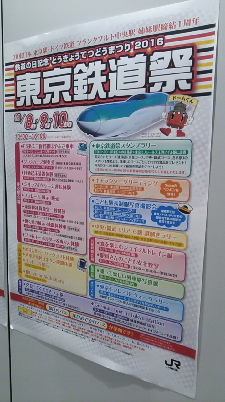 その東京駅ですが、2016年10月8日~2016年10月10日の3日間、「東京鉄道祭」というイベントが開催されるらしく駅構内にはその「東京鉄道祭」に関するポスターが多数貼られていました。