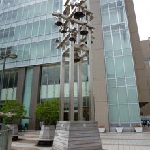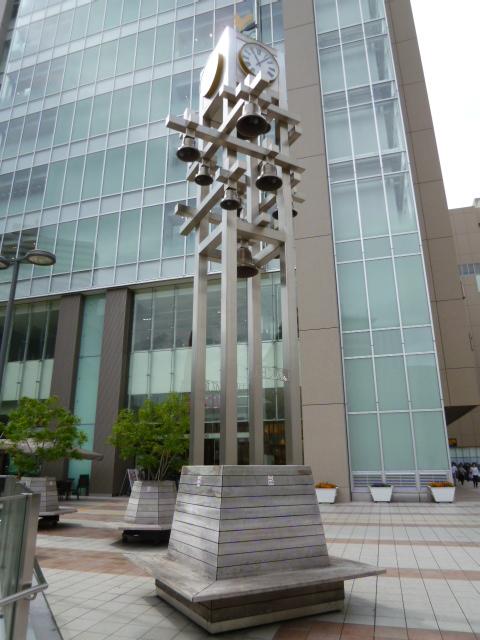 阪急梅田駅からJR大阪駅、ルクア方面に向かう歩行者用高架橋にあり、時計と鐘(カリヨン)からなるモニュメントがあります。待ち合わせにも使えますが、広場とは言っても通路程度のスペースなのですぐ分かります。また北にはヨドバシカメラが見えています。