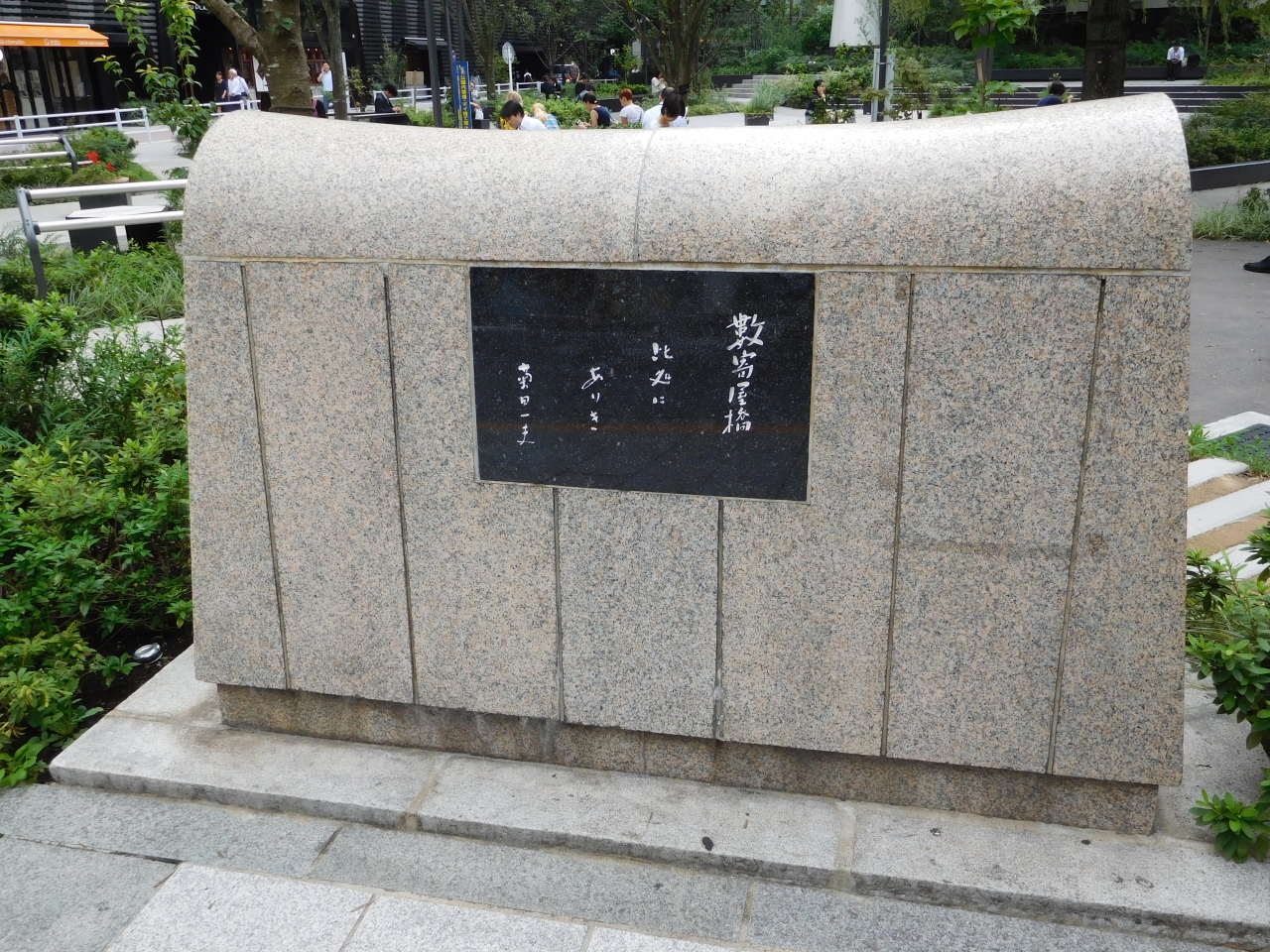数寄屋橋公園内の、数寄屋橋交差点のすぐそば(歩道側)に、ひっそりとした感じで石碑があります。道路側には、「数寄屋橋 此処に ありき 菊田一夫」とシンプルに書かれています。裏側に回って見ると、石碑の説明が書かれていました。最初に見た時は、公園の案内でも書かれているのかな?と思ったので、意外でした。