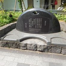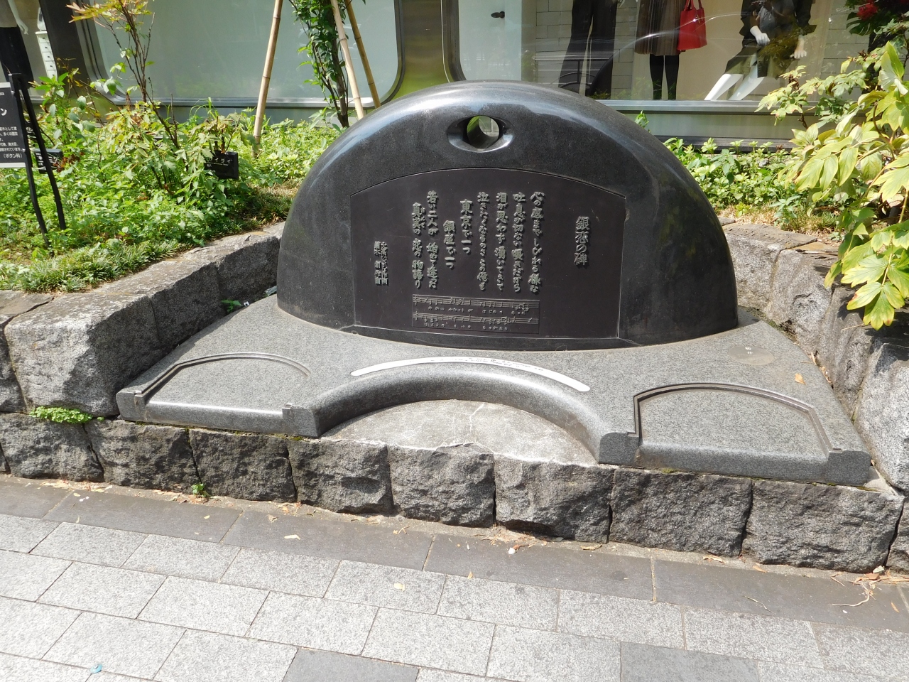 宝くじ売り場「西銀座チャンスセンター」のすぐ近く、西銀座デパートのショーウィンドウの前にあります。今まで何度もこの近くを通っていましたが、全く気づいていませんでした。黒色の石碑で、歌詞の下には、音符も書かれていました。知る人ぞ知るスポットでしょうか。