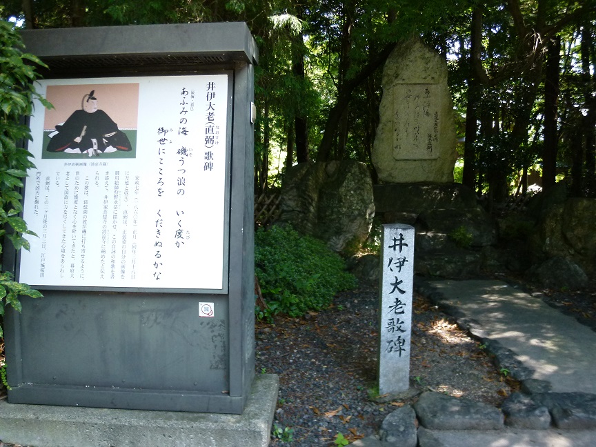 40代の若さで偉業を成し遂げ桜田門外で暗殺されてしまった井伊直弼大老思いをしたため歌碑は直筆で「あふみの海磯うつ浪のいく度か御世に心をくだきぬるかな」とあり、琵琶湖(近江)で何度となく打ち寄せられる波のように、私も世の中の為に心を尽くしてきたという歌意です。