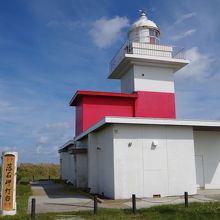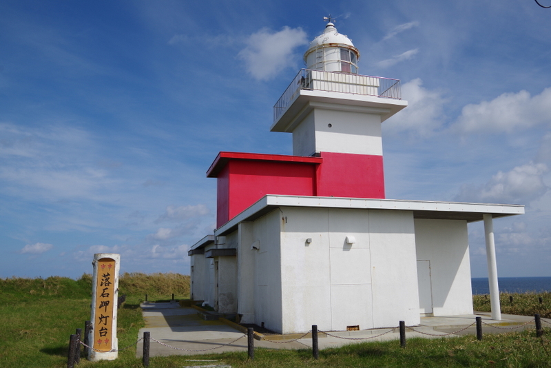 落石岬にあり、四角い塔型の形をしており、白地にちょっとピンクがかった赤い横帯が入った独特の形がとても印象的な灯台です。灯台自体も印象的ですが、太平洋に突き出した草原で覆われた台地と青い空とのコラボがよりこの灯台を引き立てているような気がします。