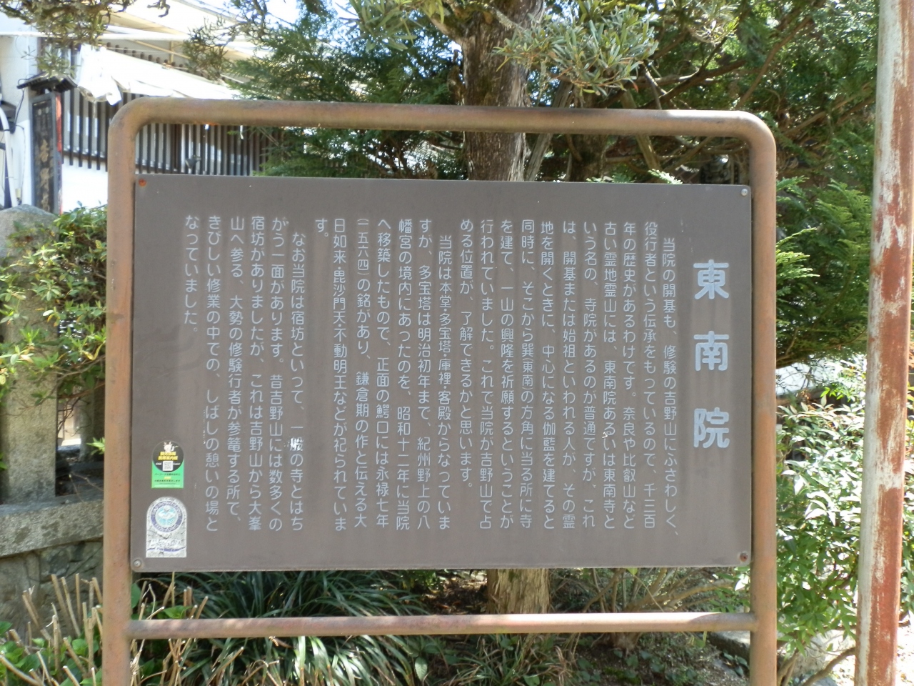 東南院は役行者の開基と伝えられる、1300年の歴史を持つ寺院です。本堂・多宝塔・庫裡・客殿からなり、鎌倉期の作と伝えられる大日如来・毘沙門天・不動明王などが祀られています。