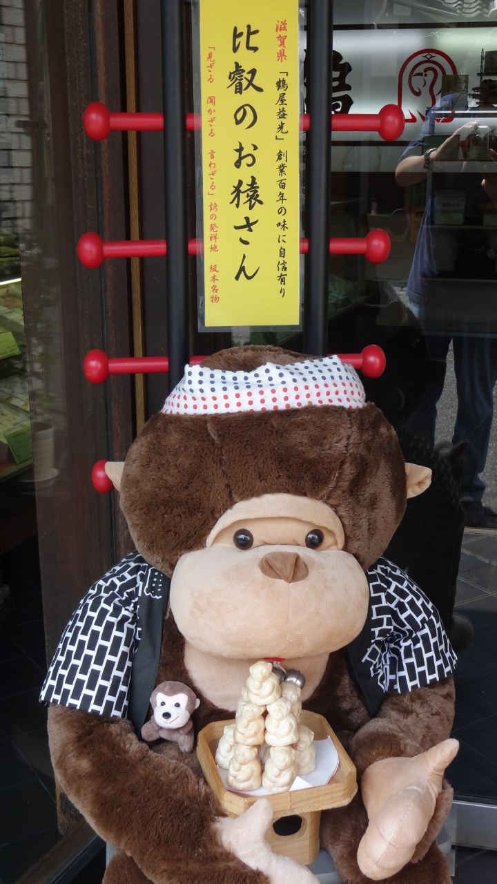 坂本の観光案内所で、このお店の「比叡のお猿さん」のことを聞いて訪れました。有名蕎麦「鶴喜蕎麦」の少し西にある小さな和菓子店です。創業約百年の老舗だそうです。お店の前には、かわいい最中のお猿さんがたくさん積んでありました。「比叡のお猿さん」は、子猿を抱いた猿の中には、こし餡がたっぷりと入っています。猿は、延暦寺・西教寺・日吉大社では古来より守り神として崇められているそうでそれに因んでお猿さんを和菓子にしたとのこと。お土産に最適です。1個150円ほどだったかな?