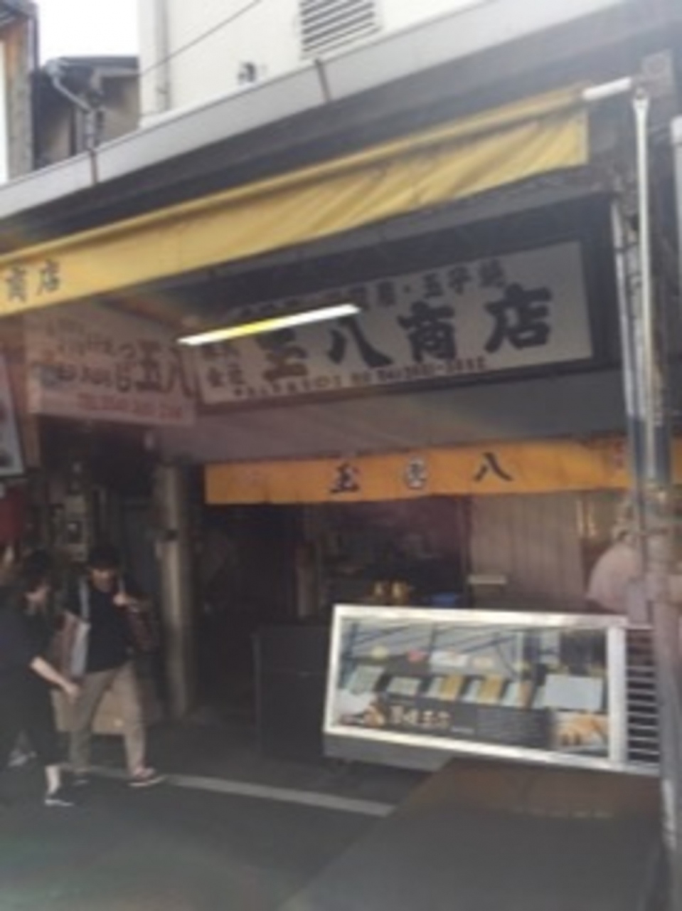 築地場外市場にある卵焼きの専門店で、ショーケースに厚焼き玉子が並んでいます。