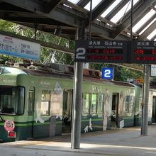 京都から坂本へ行く際に利用しました。京都市地下鉄東西線の「浜大津」駅で乗り換え、坂本駅まで約50分ほどで到着しました。石山寺駅から坂本駅までを結ぶ京阪電鉄の路線で、以前、NHKの『石坂線物語』というドラマの舞台となった記憶があります。琵琶湖の西岸をのどかに走るローカル線といった風情を感じることができました。