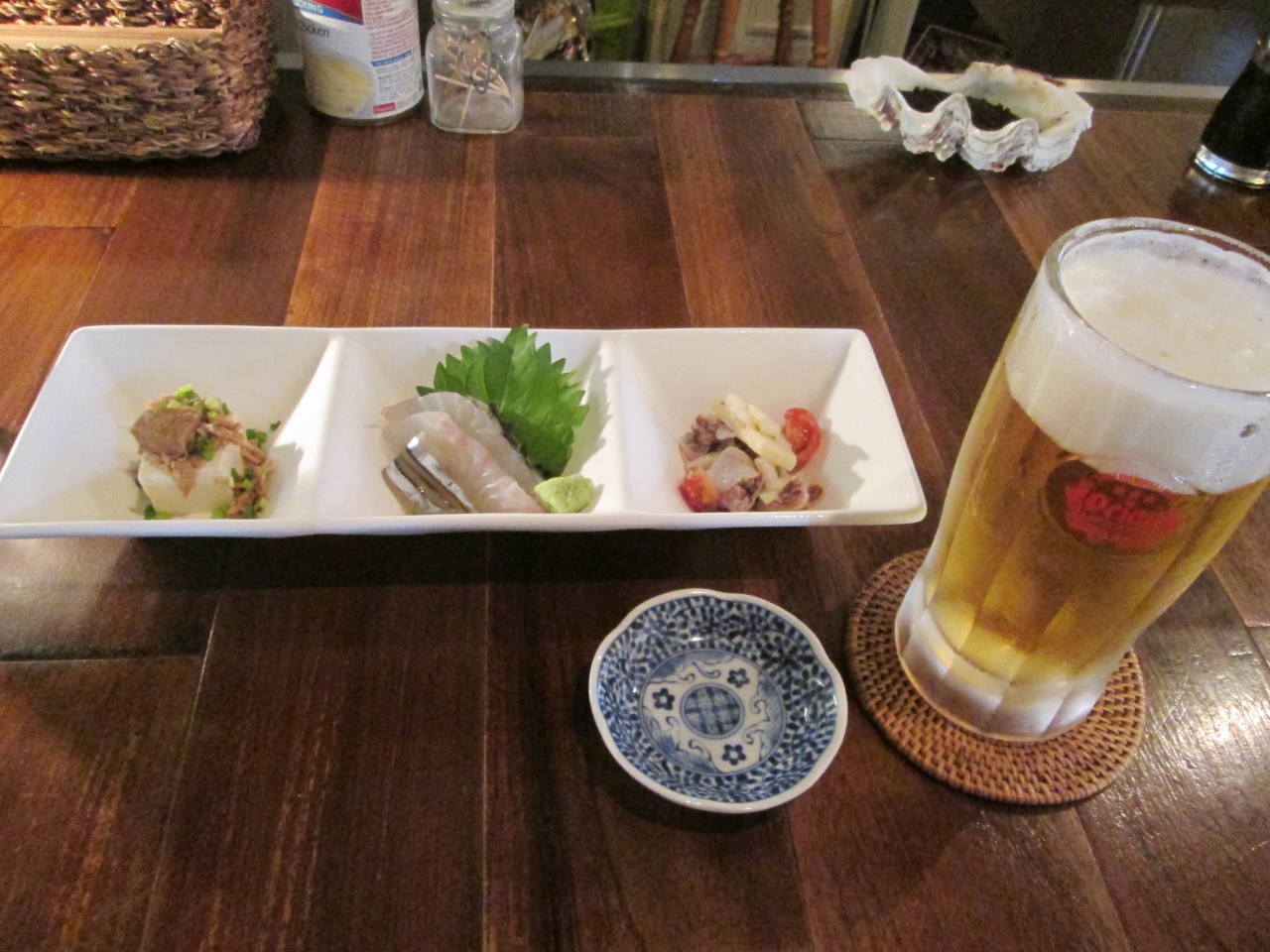 定食も美味しいしですがちょい呑みで、美味しいおつまみに、ドリンク2杯で1000円のメニューがあります。本当にちょい呑みにうれしいメニューです。オリオンビールと泡盛をいただきほろ酔い気分に。