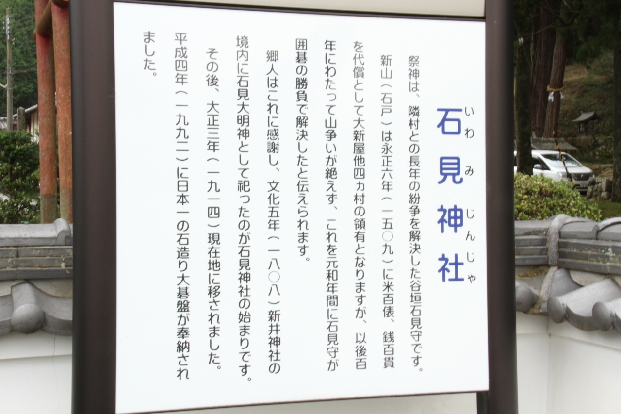 丹波市HP・・・石見神社の祭神である谷垣石見守は、隣村との領地争いを囲碁勝負での解決を図り、みごと勝利して村人に平穏な暮らしをもたらしたと伝えられています。