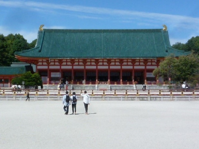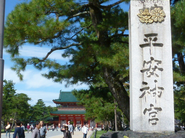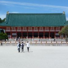 今日は京都・平安神宮に来ています。そして應天門を通って真正面に見えるのが「大極殿」です。周囲を見ると見事な朱塗りの回廊か続き、素晴らしい光景を観ることができます。しかしこの平安神宮はそう古くはありません、平安京遷都1100年を記念して建てられたものですから、まだ100年ちょいです。平安神宮は、とうぜん平安京を造った第50代桓武天皇を祀っています。さぁー近くへ行って見ましょう、ちょっと砂利がありますので足元注意してくださいね。
