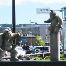 今日は京都・鴨川付近を散策しています。そして五条大橋にきましが三条四条よりも観光客は少ないですね。大橋の西詰に「五条大橋のモニュメント」はありますが、ここは国道一号線、道幅は広くスピードも出してますから、ちゃんと信号を守って歩道を渡ってくださいね。木屋町の信号の歩道からモニュメントの近くに行けます。モニュメントの弁慶と牛若丸は子供のように見えますが、可愛いモニュメントです、ご覧なってください。ちなみに当時の五条橋はちょっと南の松原橋付近だったとのことです。