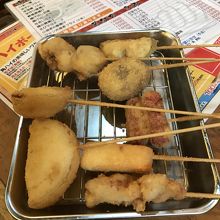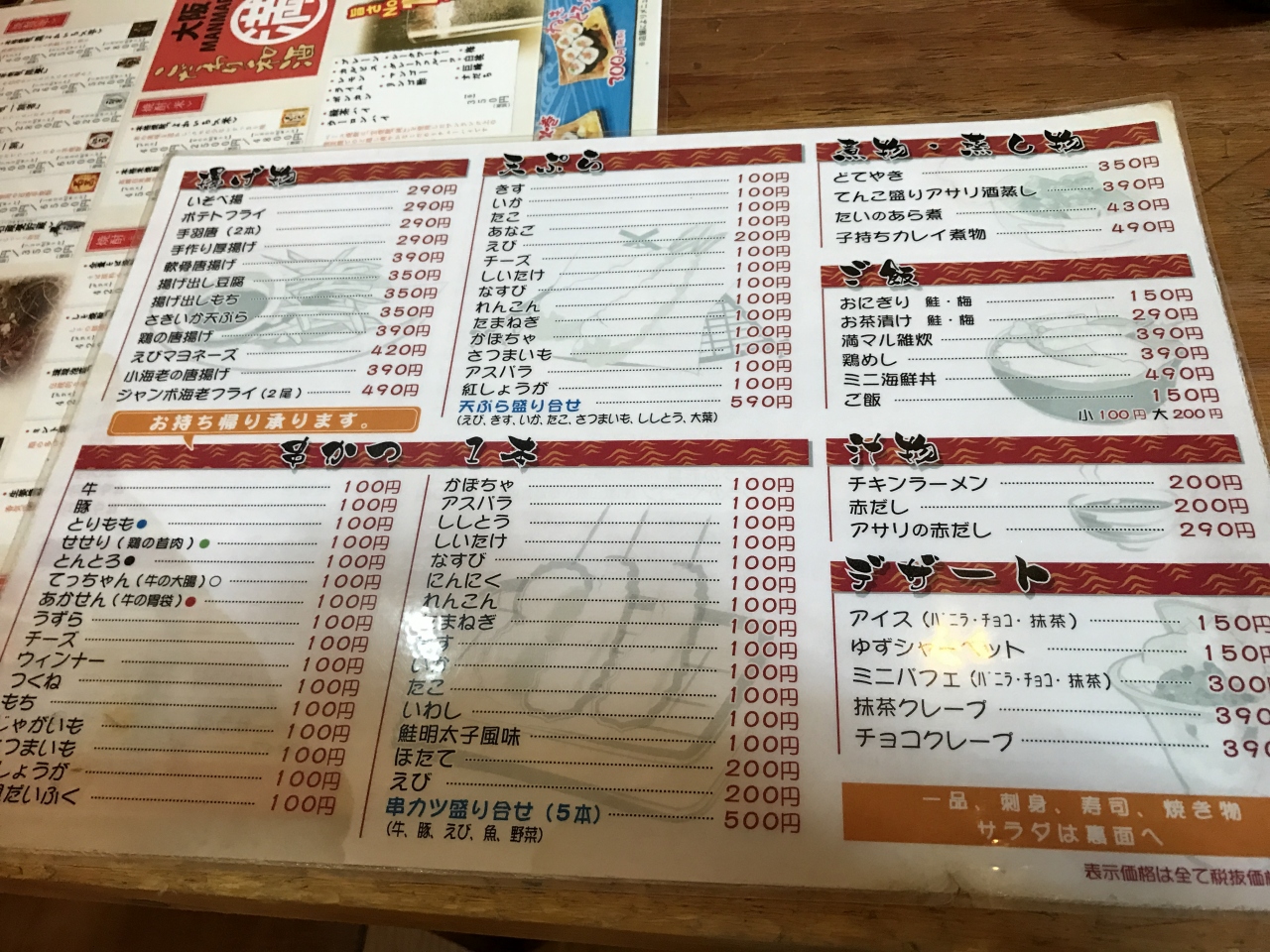 串カツはほとんどが1本100円、大坂のチェーン店屋からもちろんソースは二度づけ禁止。ただ、待ち時間が新世界の串カツ屋などと比べると恐ろしく長い。