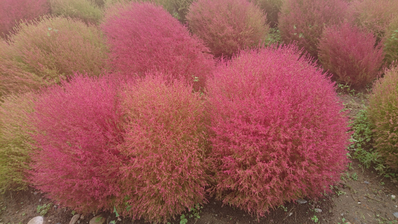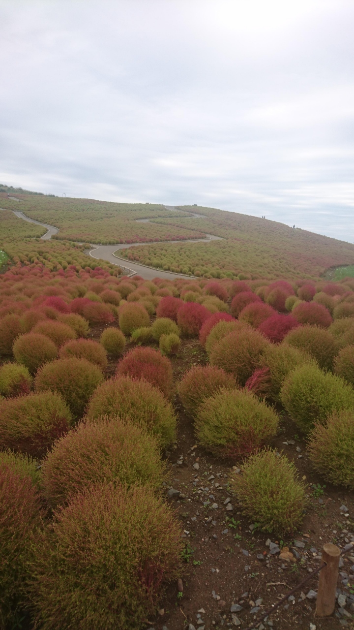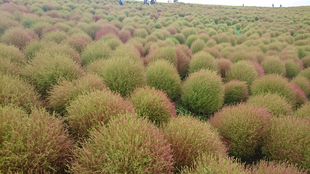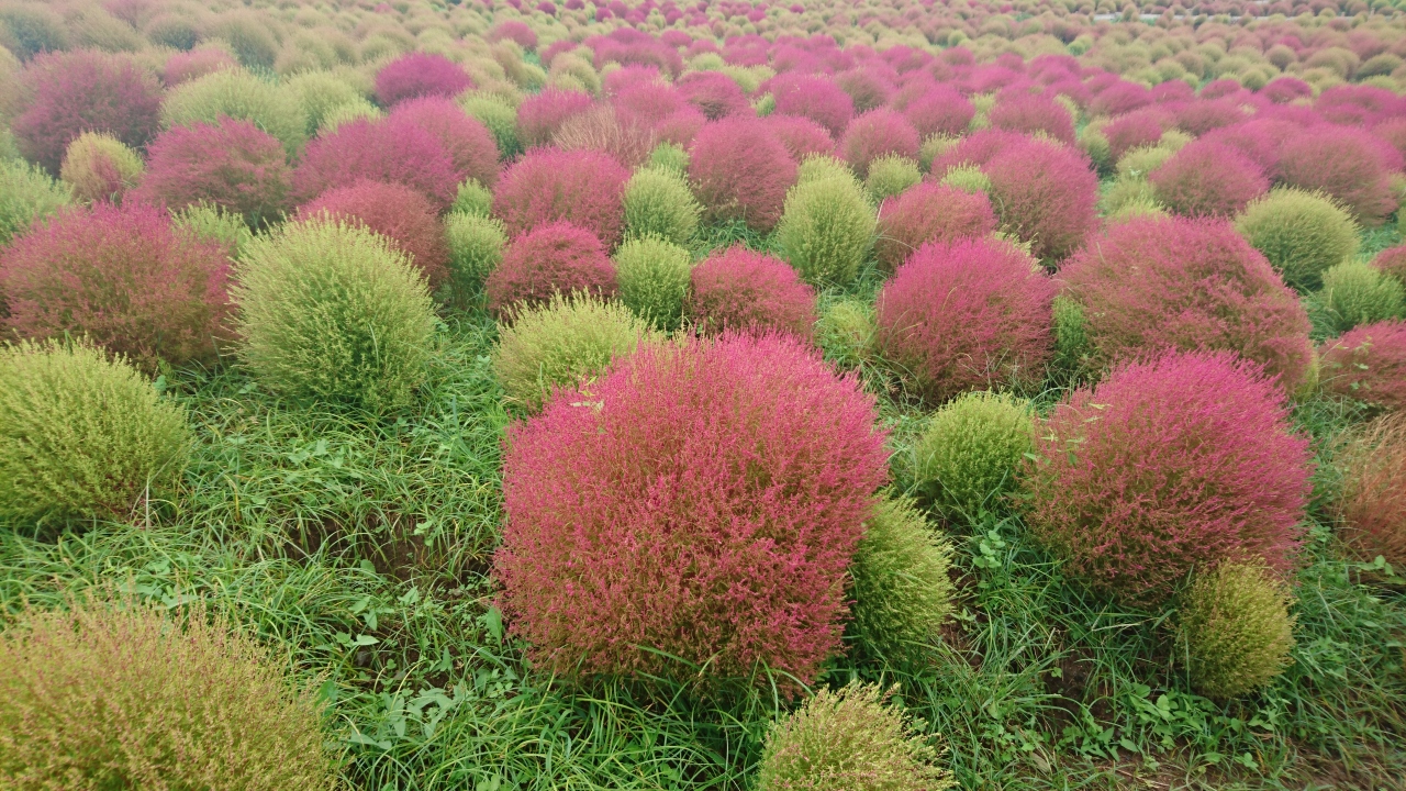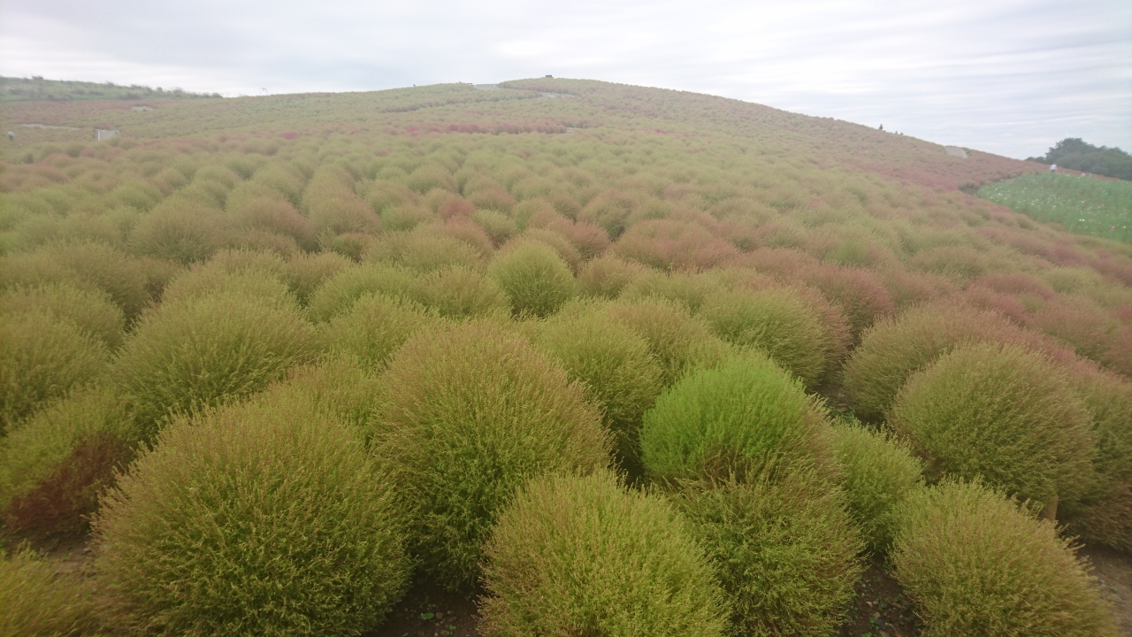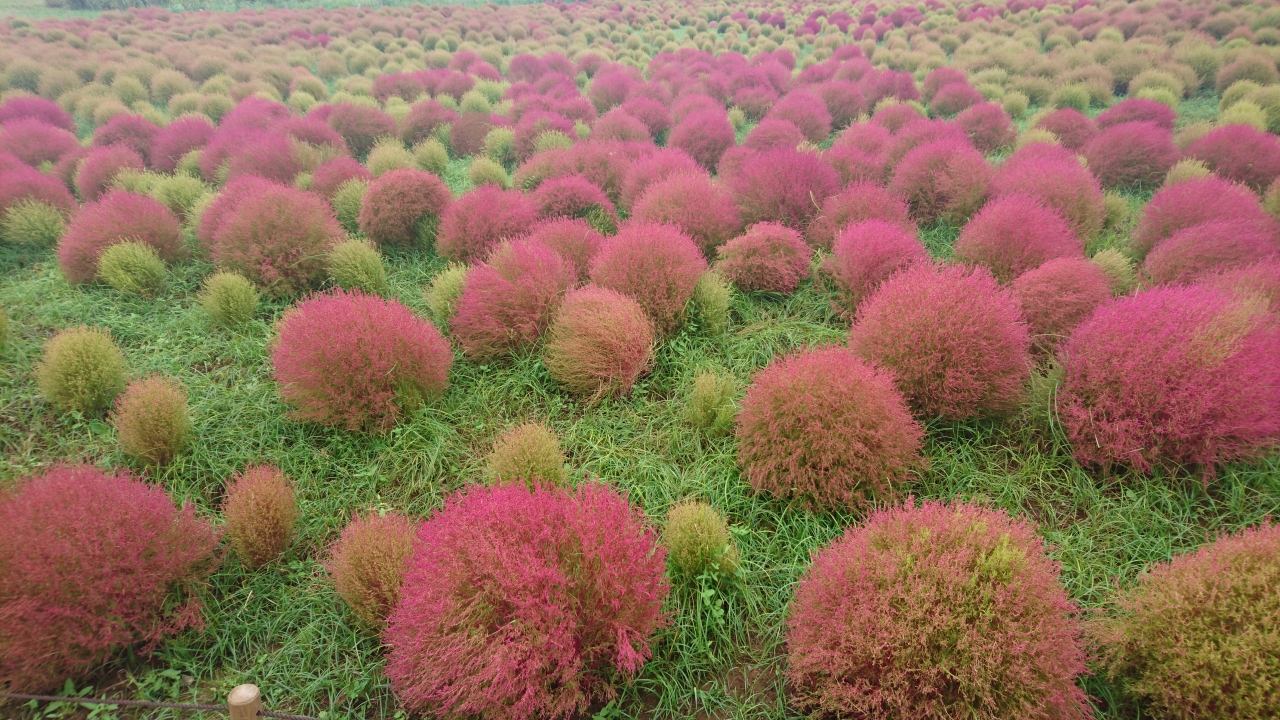 今年は昼間の気温が下がらず、コキアの紅葉が遅めと9月末頃からHPに情報が載り、また2日ごとに現在のコキアの紅葉の様子がアップされていた。