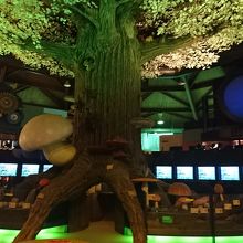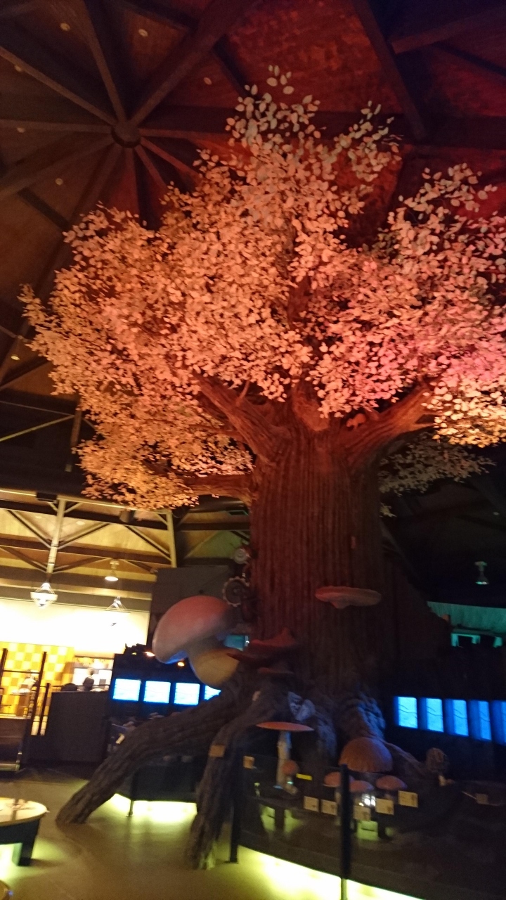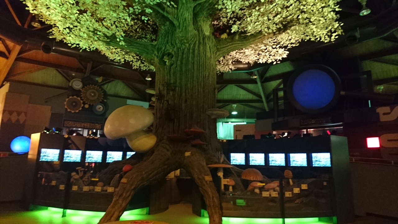正面のきのこ博士ワールドのエリアに入るとそこは広いきのこの世界。巨大な木ときのこと小動物のオブジェ?が正面に造られている。