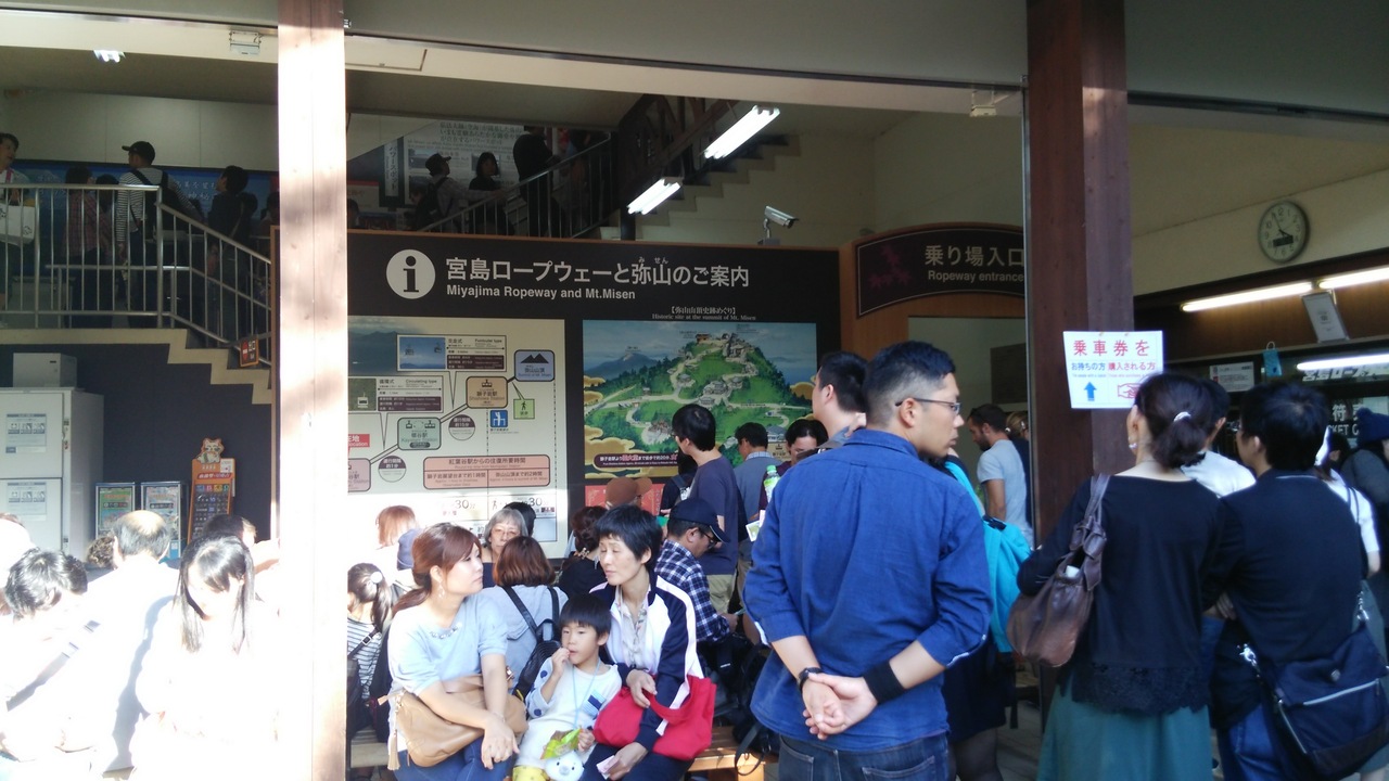 無料バスで宮島ロープウェイの乗り場まで来ましたが、一時間半待ちでした。考えたあげく、自力で山登りすることにしました。一時間ぐらいで山頂につきました。帰りはロープウェイで下山しましたが、30人乗りの大型から途中、8人のりに乗り換えました。かなり急角度でした。30分ぐらい乗りました。時間配分を考えてチケットを買った方がいいです。