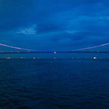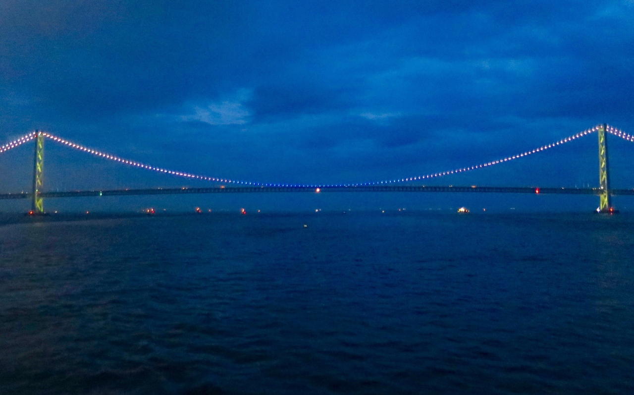 世界最長の吊橋だけに雄大壮大でお見事としか言えない規模です。あまりに大きすぎてピンときませんが、橋上を走る車と比較すると、ようやくその巨大さを認識できました。陸上から望むのもありですが、橋の下をくぐるフェリーからだとちょうど日没を迎えてライトアップされた美しい橋の姿を堪能できます。