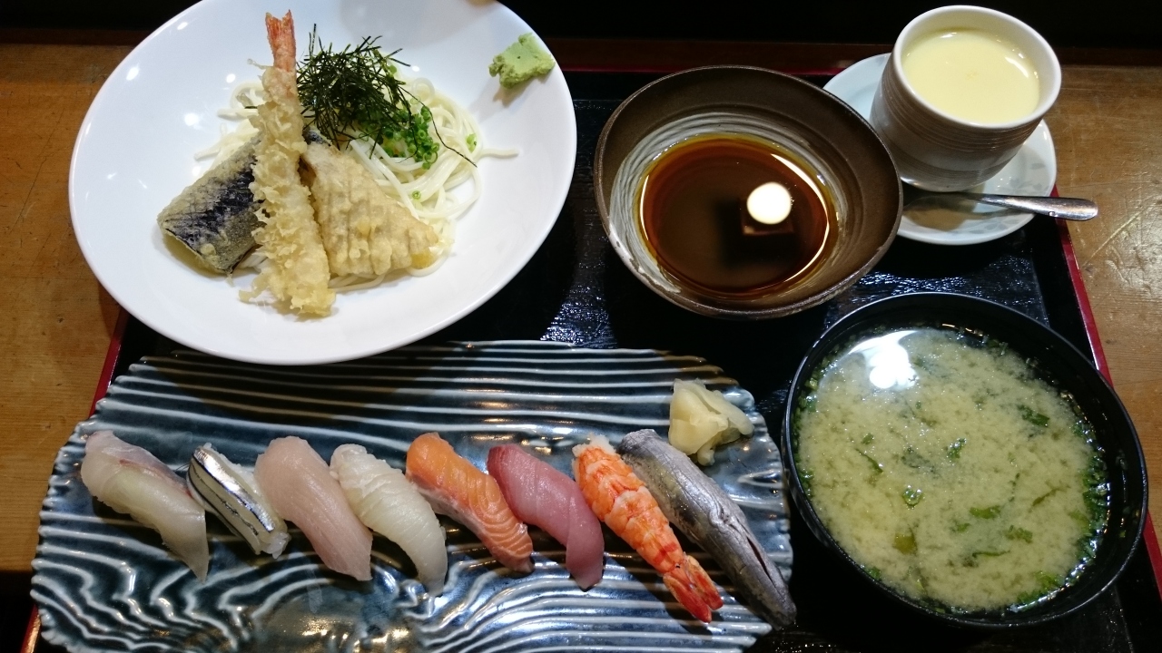 ランチメニューのお寿司15貫セット700円と、冷やし五島うどんセット900円をいただきました。
