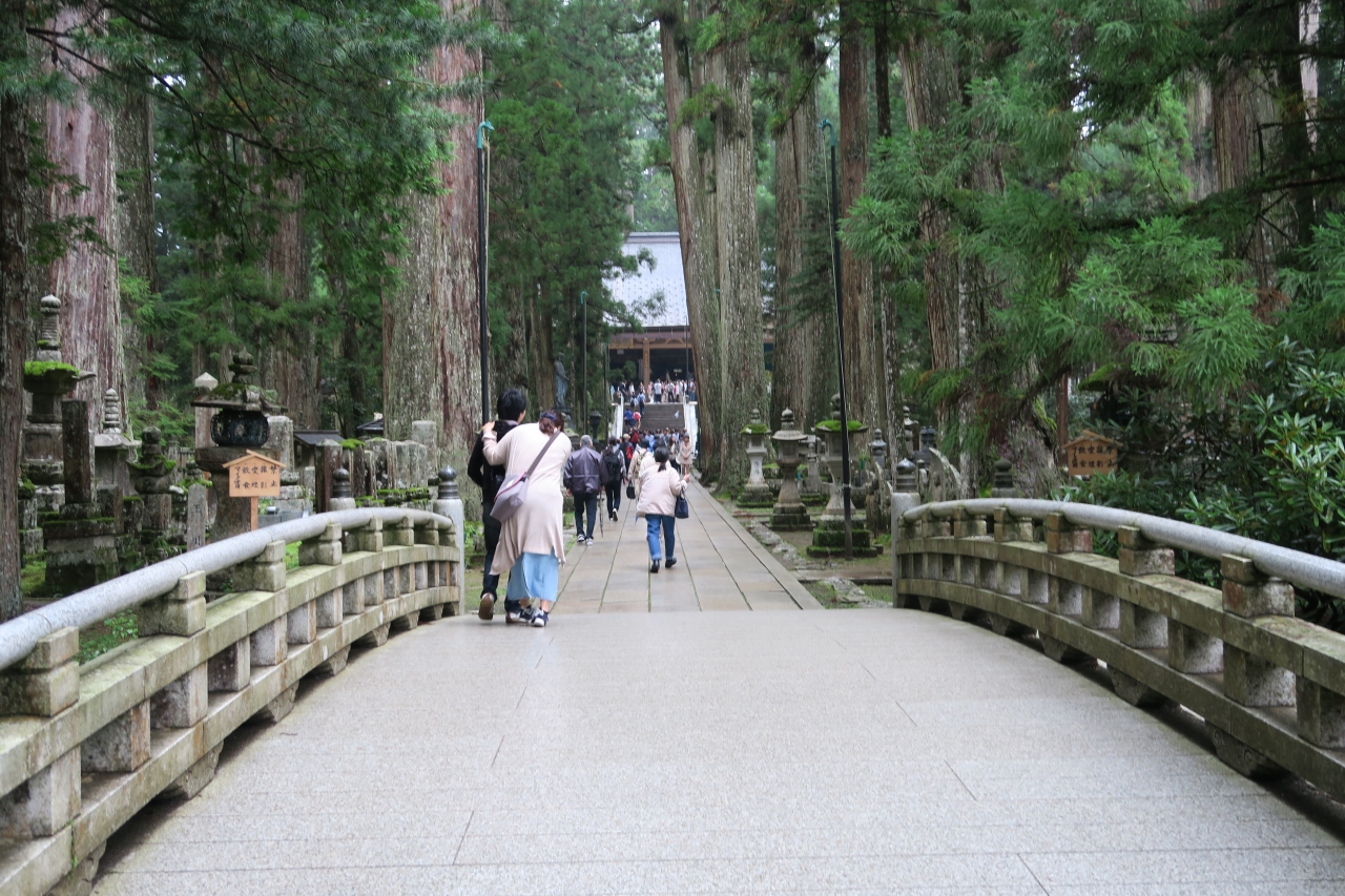 高野山を訪問し、車は中の橋の駐車場に止め、参道を奥の院へ向かう。各企業の供養塔など確かめながら歩く。旧道からは、ガラリと雰囲気が変わり、古い武将や、大名の墓碑が続く。両側の並木も大きくて立派。川を挟んでの聖域には、神妙に立ち寄る。奥の院を時計回りに一周。空海がおわします「御廟」を拝みながら巡る。最後は、地下の拝殿で、仏具に触れる事が出来た。戻る際には、仏像への水掛けをした。最後は、一の橋に向け、また旧道を歩く。一の橋を渡り終えた際は、一礼し、謝意を示す。