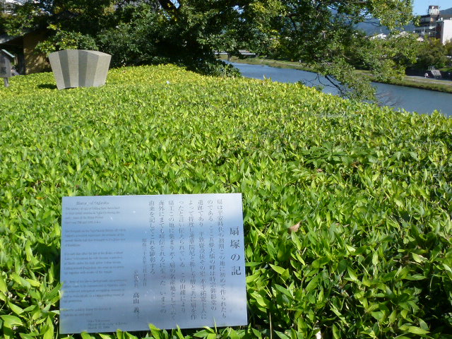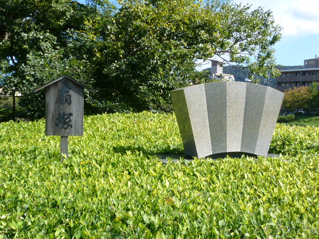 日は京都・鴨川付近を散策しています。そして五条大橋にきましが三条四条よりも観光客は少ないですね。大橋の西詰北にこの「扇塚」があります。1284年この地に御影堂が建立され御影堂扇はつくられました。この地がその発祥の地であることから扇形の碑を1960年に建立されました。鴨川の横の緑の上に建っていて周囲には公園が、開放的で視界の広い場所に建っています。またその前には弁慶と牛若丸の「五条大橋のモニュメント」もありますので合わせて散策してください。