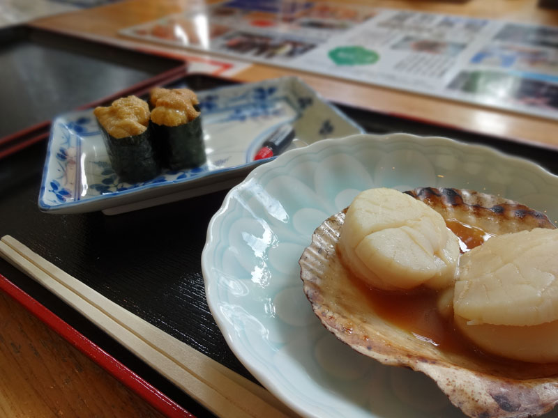 オタトマリ沼のすぐそばにあります。 私が行った時はウニ軍艦(ムラサキ)1貫600円でホタテは2つで500円、トウモロコシは300円でした。 大自然をすぐそばに感じながらご当地感満載のものがいただけるのは魅力的。トイレもきれいでした。