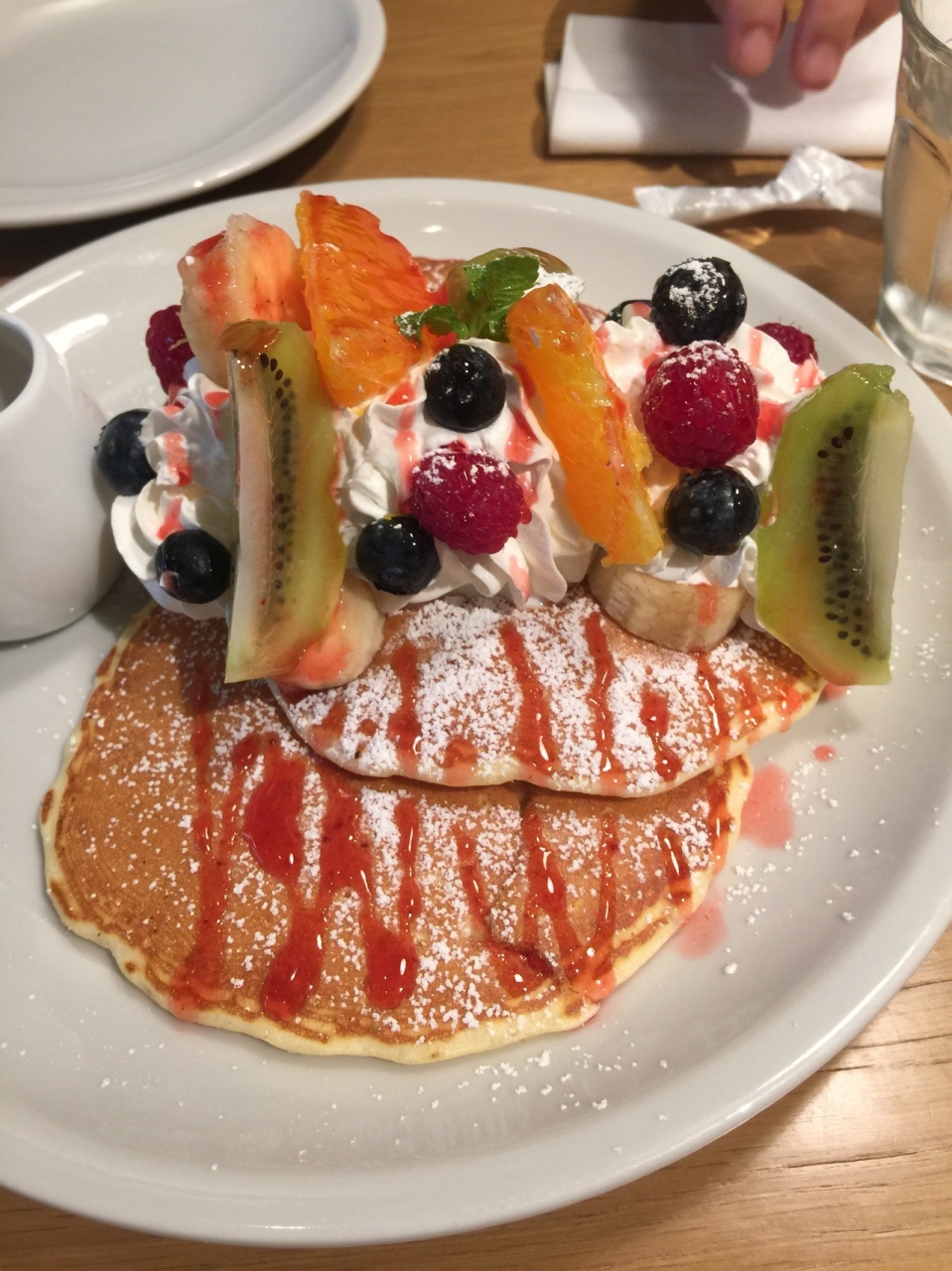 フルーツパンケーキは3枚のパンケーキにたっぷりの生クリームとフルーツがのっていて美味しかったです。