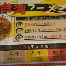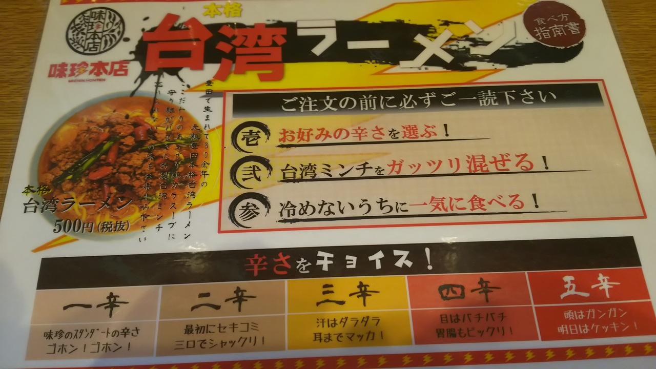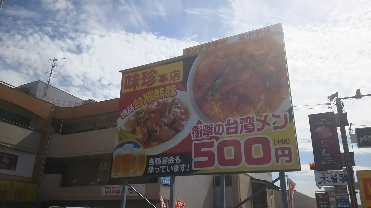 R248沿いにある台湾ラーメンが有名な店。「台湾ラーメン500円」という大きな看板があります。ただ単品で注文してみて感じたのがサイズが小さいということ。周りを見渡すとみんなセットで頼んでいました。辛さが5段階あり、下から2番目を選びましたがそれでもかなり辛かったです。