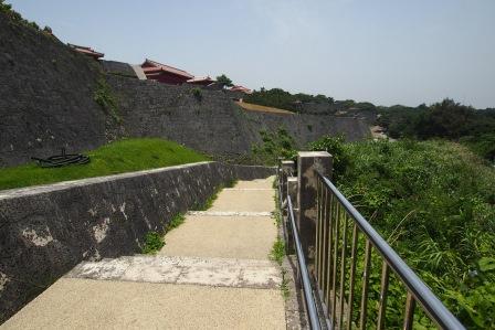 正直なところ、観光の目玉とするため復元されたように思える数々の建物には興味はありませんでしたが、それでも切手コレクターだった子供時代へのノスタルジーとして守礼門だけは見ておこうと、ゆいレールの駅から城の外壁に沿って石畳の道を散策がてら向かいました。地形図ではないグーグルマップなどではよくわかりませんが、首里城はけっこう高台に位置していて歩いて行くのは若干しんどいです。ただ、自分の目には慣れないガジュマルの太い木や、右側に広がる首里の街並みのこれまた見慣れない屋根瓦を、てくてく歩きながら眺めるのは楽しいひとときでもありました。