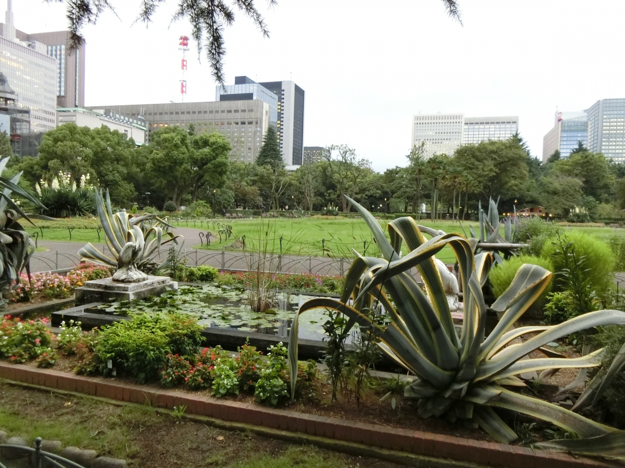 日比谷公園第一花壇の前にある小さな池、そこに2羽のペリカンが向かい合っています。それぞれ口から噴水が出るのですが、勢いはなくあまり見どころとはいえませんが。そのぺリカンも年季が入っているのか、若干の汚れが目立ち、色的に周辺の草木とあまり見分けが付かない感じでした。歴史を感じるとも言えなくもないですが。