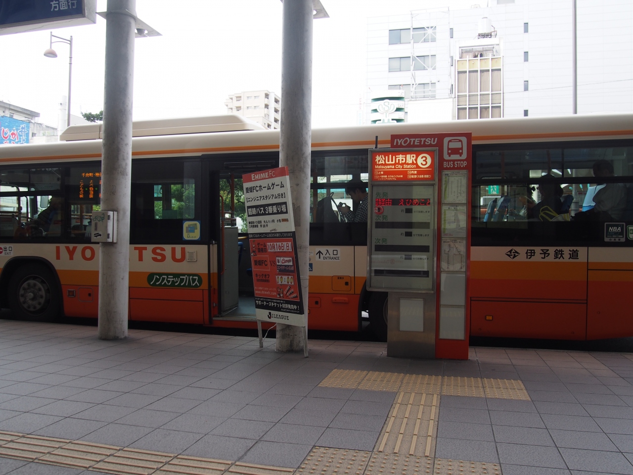 松山市駅前には伊予電鉄のバスターミナルがあります。高速バスなどの発着場所もあります。観光などでは路面電車ではいけない場所にはバスが役立ちます。サッカースタジアムには地元サッカークラブの試合に合わせて臨時バスがでていました。