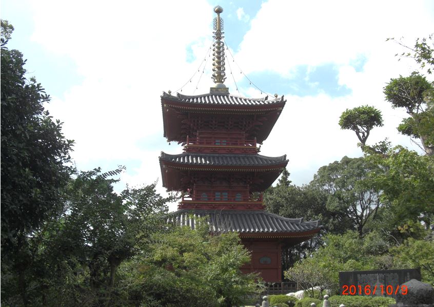 歴史を感じる門を2つくぐると左側に三重の塔が見えてきました。