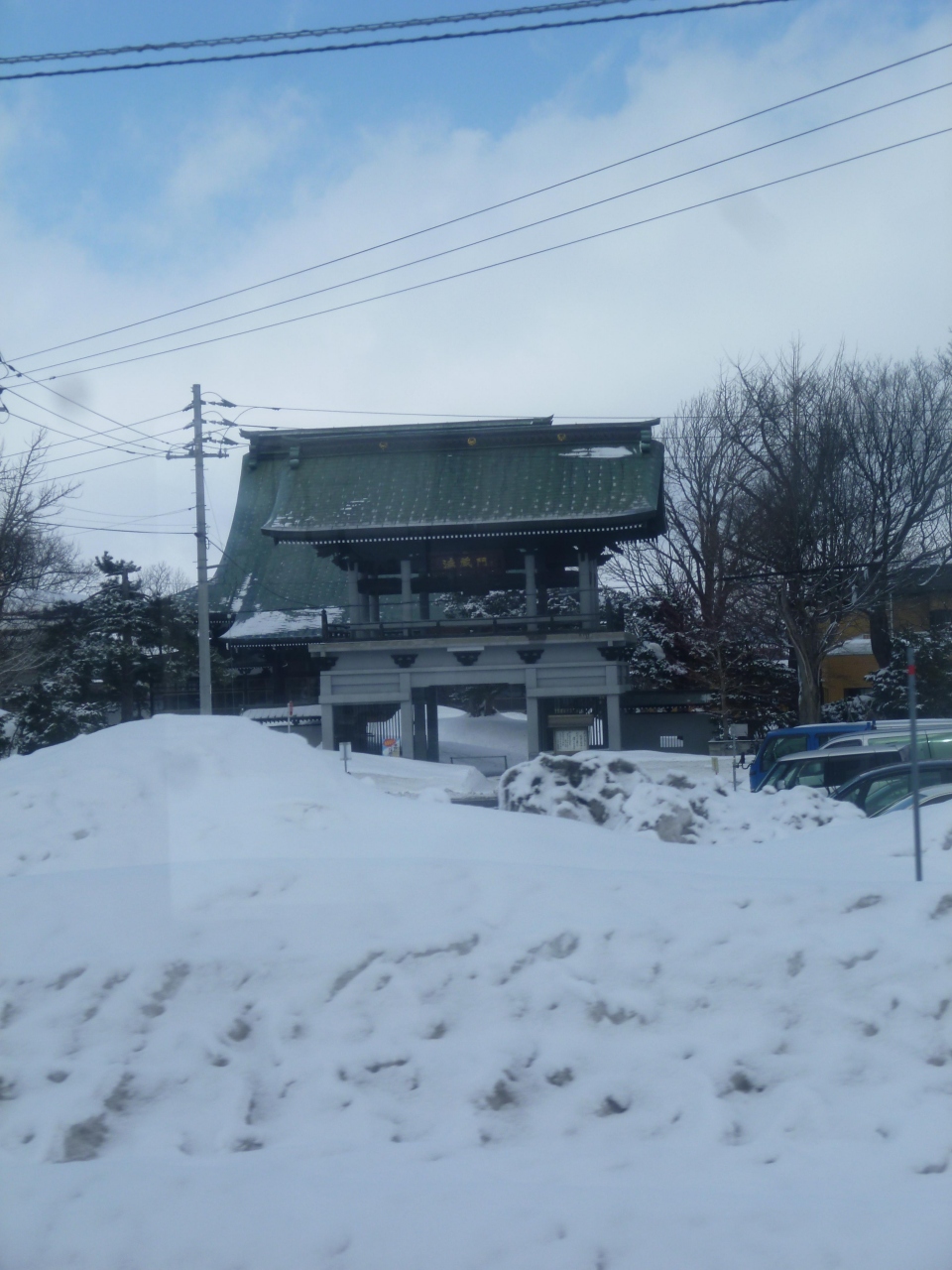 雪でも目立つ山門に本堂の青銅葺き屋根