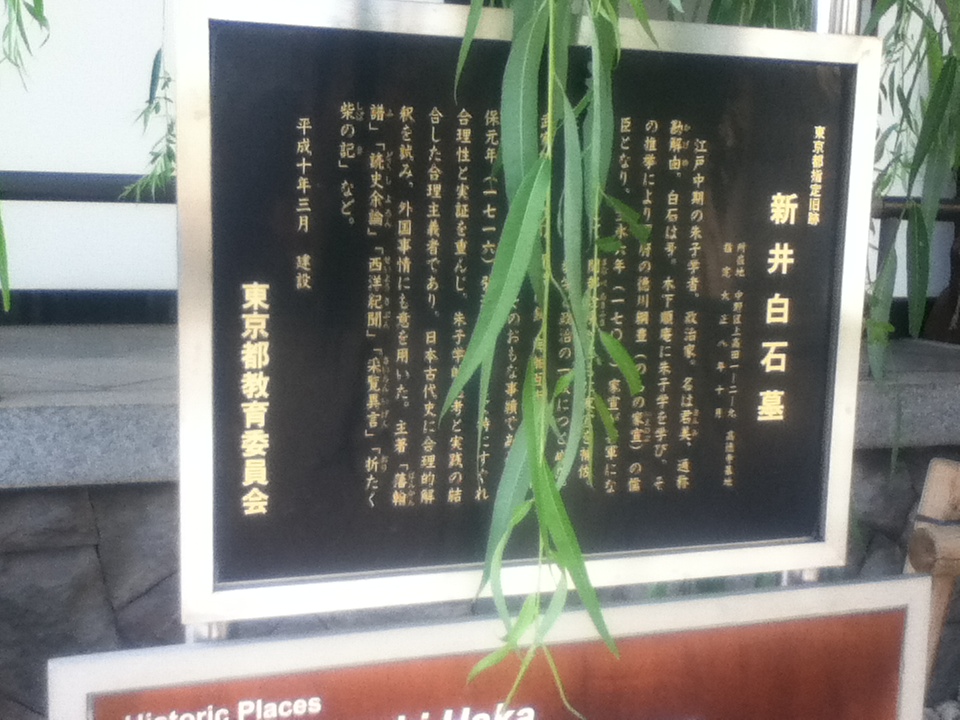 地下鉄落合駅の南西、早稲田通り沿いの高徳寺内にある。お墓は一般的な形状のものである。新井白石は江戸中期の朱子学者、政治家で、家宣将軍を幕臣として補佐するとともに、正徳の治を開き数学と政治の一致に努めた。本堂手前に説明板がある。新井白石に関心や知識のある方は訪問するのもいいかもしれない。