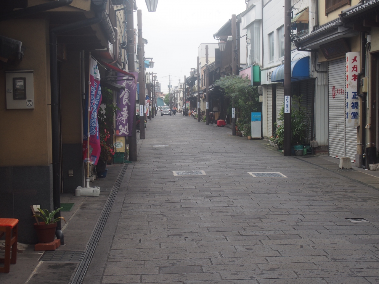 八町大路は臼杵市街地のメインストリートで大手門前から臼杵川までの500mほどの通りです。通りはアスファルトから敷石になっていたり、電柱は茶色に塗られ目立たなくされています。両側の店は2階建ての木造の歴史を感じる店が並んでいます。通りの入口には歩行者専用路と出ていますが、車も結構走っているのは残念です。