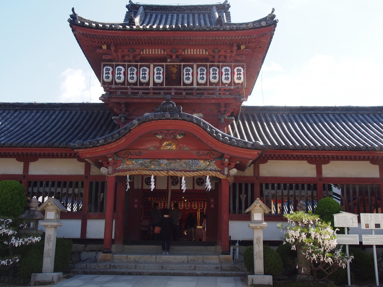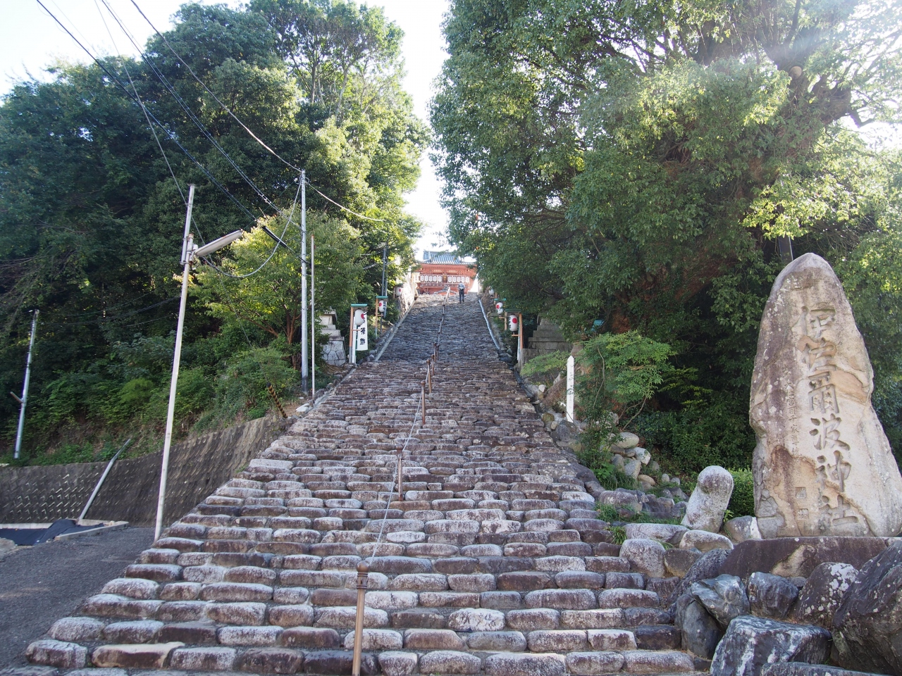 道後温泉駅を降りて数分歩くと神社の入口にあたる階段の下に着きます。ここから135段ほどの石段を上っていくと神社の本殿です。石段はかなり足腰に来ます。本殿は16世紀の建造の歴史あるものだそうです。帰りは裏側の駐車場から降りて行けます。