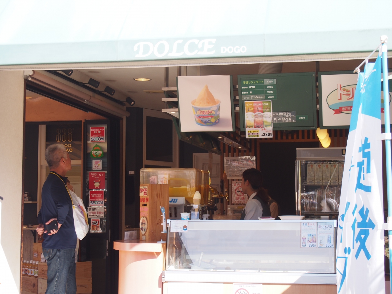 道後温泉の本館のすぐ近くにある坊ちゃん広場にある店です。ジェラート、伊予みかんのジュースなどがあります。坊ちゃん広場はゆっくり座って飲んだりできる場所があるので、観光の途中に立ち寄って休憩している人もいました。ジェラートを食べながらのんびりしていました。
