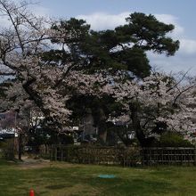 柵で囲まれたスペースに大きな碑と松の木、周りには桜や梅の木があり満開でした。
