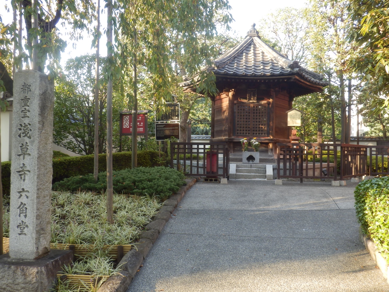 浅草寺の本堂の左奥には、影向堂がありますが、その左横にひっそりとあるのがこちらの六角堂です。周りのお堂は真っ赤な柱や壁が目立つものが多いですが、こちらは木造の地味なもので、木の茂みの中にひっそりと隠れているようでした。しかし、建立は1618年と言われていて、浅草寺の中では最も古いものだそうです。