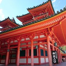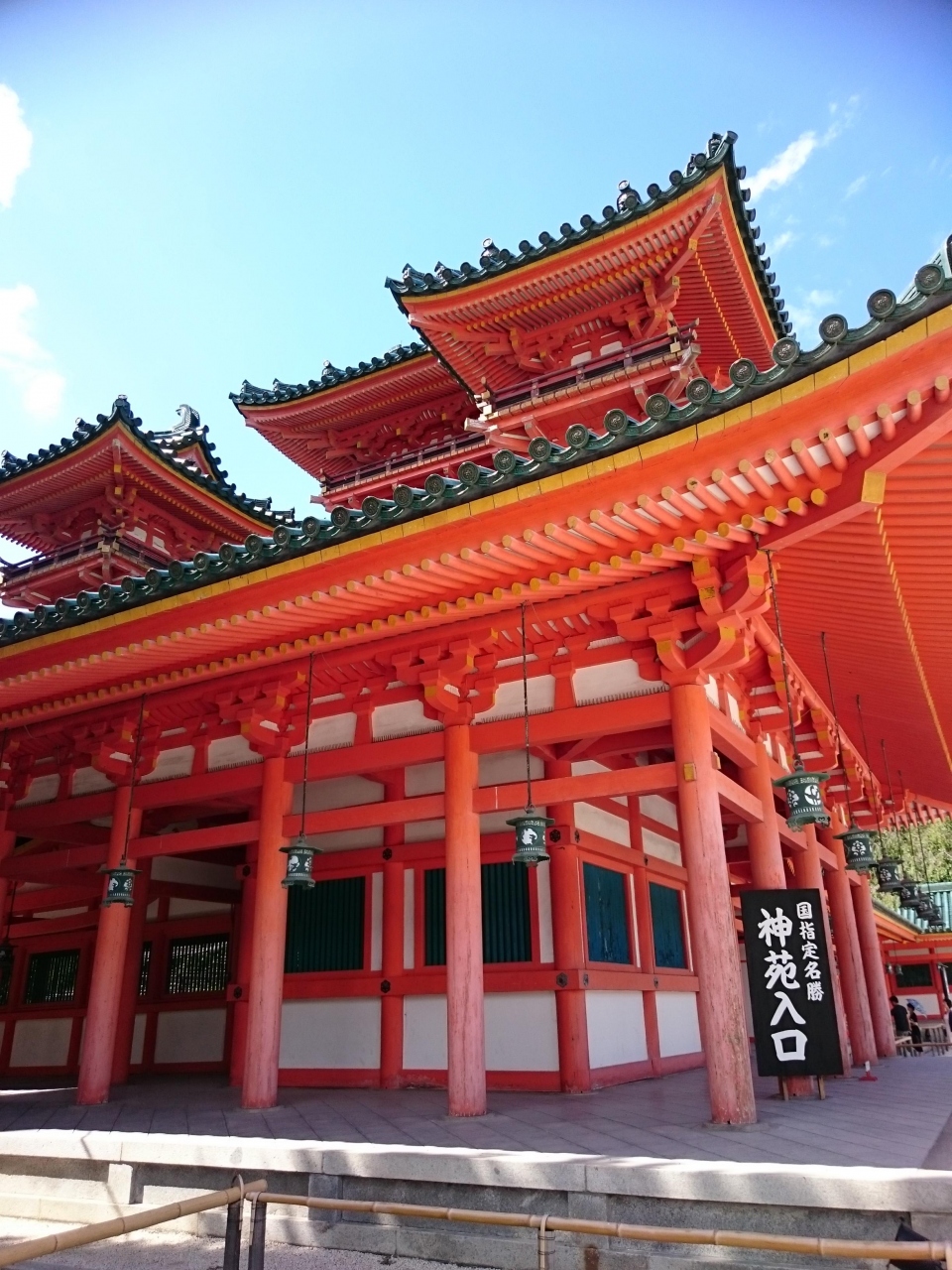 この観光名所の平安神宮へは八月下旬に、4泊で京都旅行に行った際に訪れました。中に入った時ですら平安神宮の迫力には圧倒されていましたが、ここでもその綺麗な赤色の荘厳さに驚かされました。いってよかったと思いました。