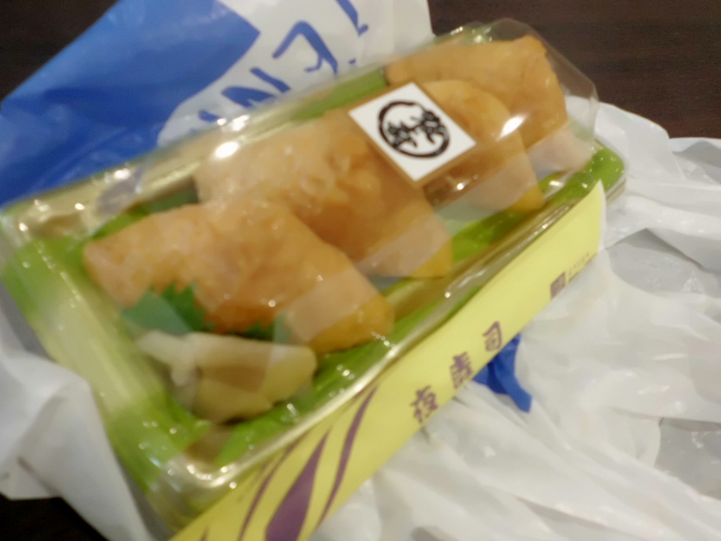 天満屋の地下フードガーデンにある夜寿司です。小さいコーナーですが、行楽のお供のお弁当などにぴったりの商品を置いています。食べきりサイズの助六寿司やいなりずしなど少しお寿司が食べたいときなどに良いです。いなり寿司を購入したらわかめスープのインスタントも袋にいれてくれていました。
