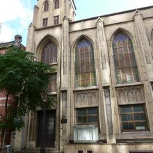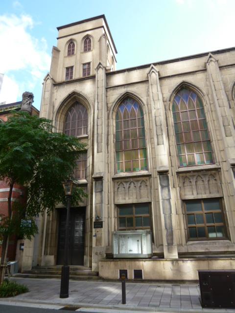 オフィス街である大阪・北浜の一角に建つ浪花教会は、ゴシック様式の尖塔や色ガラスが美しい3階建ての建物で昭和5年(1930)に竣工しました。なお設計者のウィリアム・メレル・ヴォーリズは心斎橋大丸を設計したことでも知られています。場所は少しわかりにくいですねが、次のように歩くと分かりやすいです。北浜駅で地下鉄堺筋線を降り三井住友銀行の重厚な石造りの建物まで堺筋を南に下り、そこで右折して徒歩3,4本分行くと左手にれんが作りの結婚式やパーティーに使われている建物がありますので、その交差点を左折したところです。私が訪問した時は生憎中にははいれませんでした。ミサの時以外は入れないのかもしれませんね。