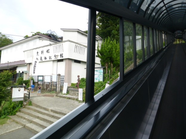 この記念館の右側に有料の飯盛山スロープコンベアが通っていますがこれに乗ると記念館を通り過ぎてしまいます。階段を登ってくださいね。